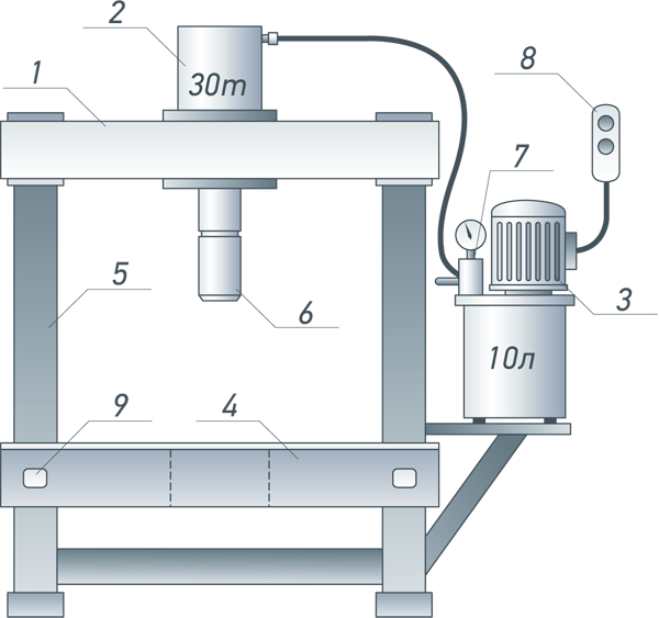 Пресс устанавливается на прочный фундамент с глубиной заложения, зависящей от грунта, но не менее 500 мм.
