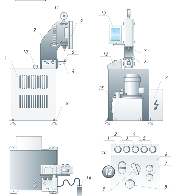 Панель управления (12) оснащена индикаторами работы пресса, кнопочным модулем включения маслостанции, кнопками ручного управления прессом, а так же кнопкой «общий стоп».