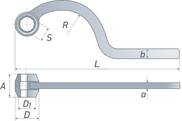 SРазмер зева | LДлина ключа | RРадиус изгиба | DДиаметр головки | D1Диаметр фаски | bШирина рукояти | AТолщина головки | aТолщина рукояти |